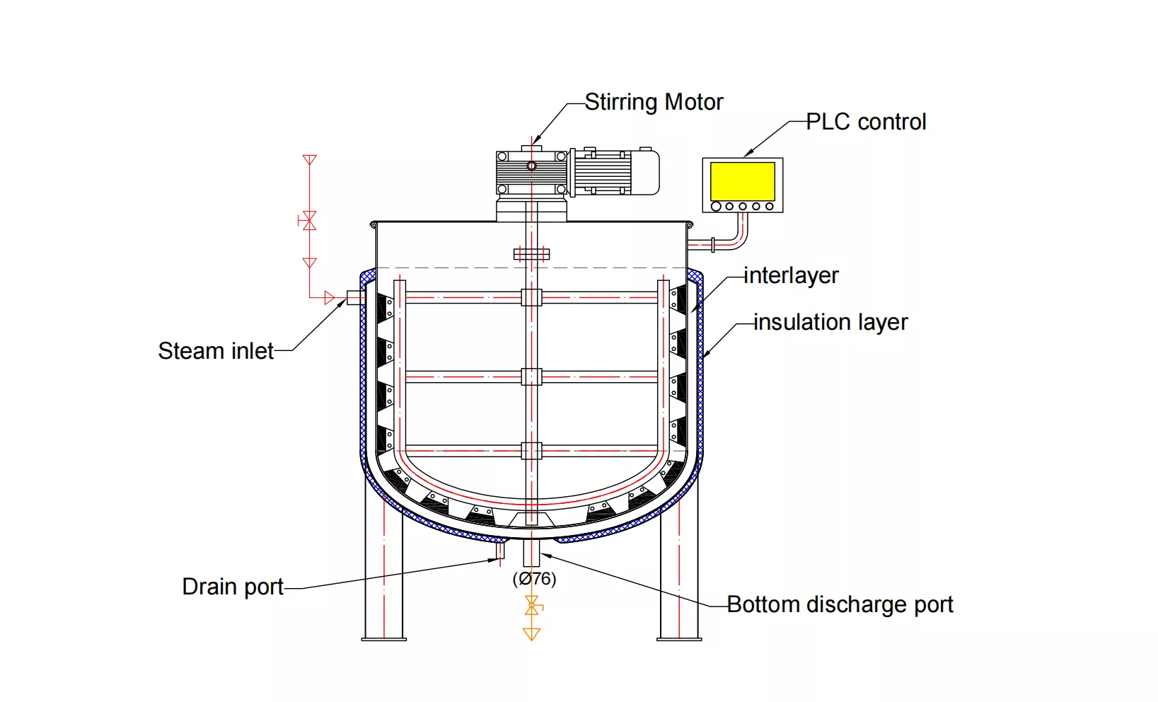 Made of food grade 304/316 material, PLC+touch screen programming automatic control reduces manual intervention, a variety of agitators are available, and the bottom elliptical head structure enables the agitator to perfectly contact the pot wall; the materials are mixed more evenly and are convenient for bottom discharge.