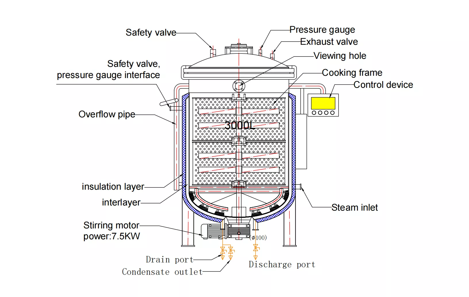 Vertical steam sterilizer is mainly used for steaming and cooking materials such as broth, fish soup, rice, corn, etc. On the basis of sealed steaming, a stirring function is added to make the steaming process of the materials more complete and uniform.